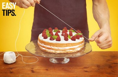 Быстро нарежьте торт при помощи прочной и тонкой нитки. Пальчики оближешь!